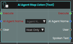 The AI Agent Stop Listen (Text) node is used to make the AI stop listening to the user. When activated, this node halts the AI’s ability to process further user input, allowing the AI to respond based on the information gathered up to that point.