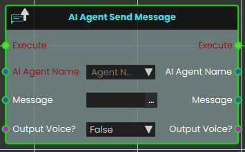 The AI Agent Send Message node enables the system to send a specific text message to an assigned AI Agent for processing. The Output Voice? boolean parameter that dictates how the AI agent will deliver its response: