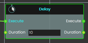 The Delay node waits for the specified Duration (in seconds), then executes the node linked to its Execute output.