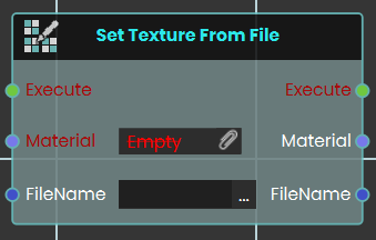 This node replaces the current texture of a specified material with a 2D image file stored in your Resource Management system. By inputting the exact file name, you can dynamically update the visual appearance of any object using that material during the experience.
