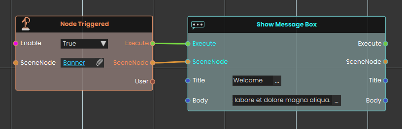 The Show Message Box node displays a floating text panel directly above a specific 3D object in the VR scene. Once activated, the node takes the targeted SceneNode input and generates a visible UI element containing the text strings provided in the Title and Body inputs, to provide contextual information or instructions to the user.