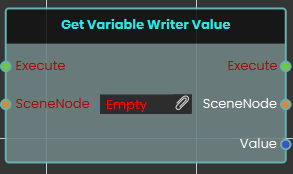 The Get Variable Writer Value node retrieves the pure data value from a designated SceneNode (the target Variable Writer object) and outputs this core Value for use in your logic.