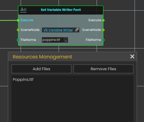 The Set Variable Writer Font node allows for targeted typography changes by updating the font of a single, specific Variable Writer rather than the entire environment. By assigning the target SceneNode and providing the FileName of a valid .ttf font file (previously imported through the Resource Management tab), this node applies the new text style exclusively to the selected object, leaving all other text in the scene unaffected.