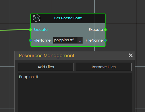 The Set Scene Font node updates the typography globally by changing the font of every Variable Writer object currently present in the VR scene. This node requires the exact FileName of a TrueType Font (.ttf) as its input. To function correctly, the designated .ttf file must first be imported into your project via the Resource Management tab in SimLab Composer.