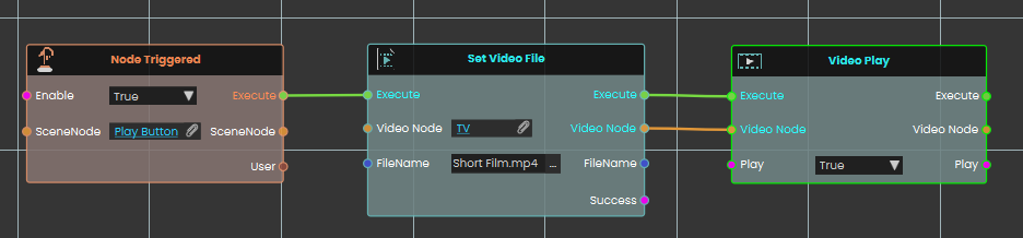 The Set Video File node allows you to dynamically attach or change the media source of a specific Video Node within your scene. By assigning the target Video Node and inputting the exact FileName of your desired video (such as an .mp4), this node updates the object's media. For this to function correctly, the video file must first be imported into your project through the Resource Management tab. It also outputs a Success boolean to verify that the file was found and loaded.