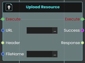 The Upload Resource node enables the system to send and save resources to the SimLab File Vault during a live VR experience. This node requires the destination URL for the file vault, as well as the assigned "FileName" for the file being uploaded and outputs a "Success" boolean.