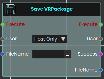 The Save VRPackage node enables the system to save the current, active VR experience as a standalone .vrpackage file, directly from within the VR session itself. It requires a "FileName" to name the new package and includes a "User" dropdown (e.g., "Host Only") to specify which user is authorizing the save. It outputs a "Success" boolean and the final "FileName" to confirm the action.