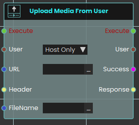 The Upload Media From User node functions similarly to the standard Upload Resource node by sending files to the SimLab File Vault via a designated URL. This node is specifically designed for multiplayer VR Collaboration environments.
