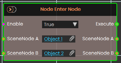 The Node Enter Node event is triggered when Scene Node A enters Scene Node B. Both nodes can be any nodes in the assembly tree — for example, Node A could be a screwdriver and Node B could be a screw.