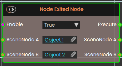 The Node Excited Node event is triggered when Scene Node A exits Scene Node B. Both nodes can be any nodes in the assembly tree — for example, Node A could be a screwdriver and Node B could be a screw.