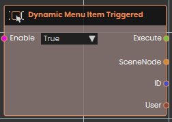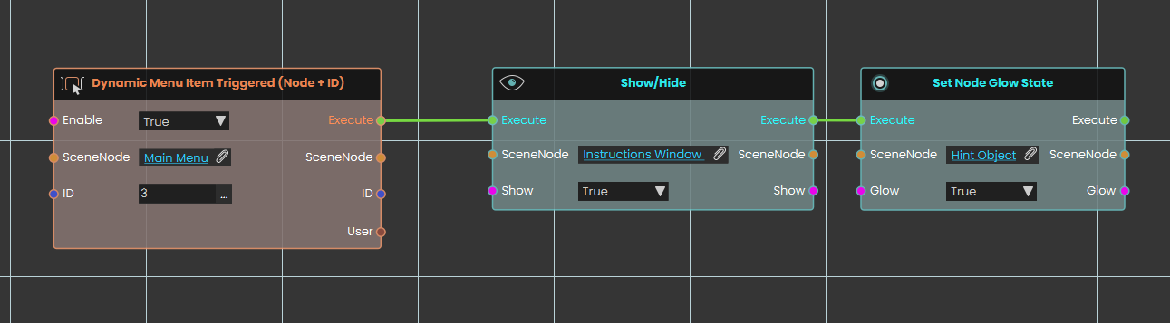 In this example, the Dynamic Menu Item Triggered (Node + ID) node is configured to act as a "Help" button. By setting the SceneNode to "Main Menu" and the ID to "3", the system listens exclusively for that exact button press on that specific menu object. Once the user clicks this button, the execution flow passes to a Show/Hide node configured to display an "Instructions Window" by setting its state to True. Immediately following this, the flow triggers a Set Node Glow State node, which applies a visual highlight to a designated "Hint Object" to guide the user.