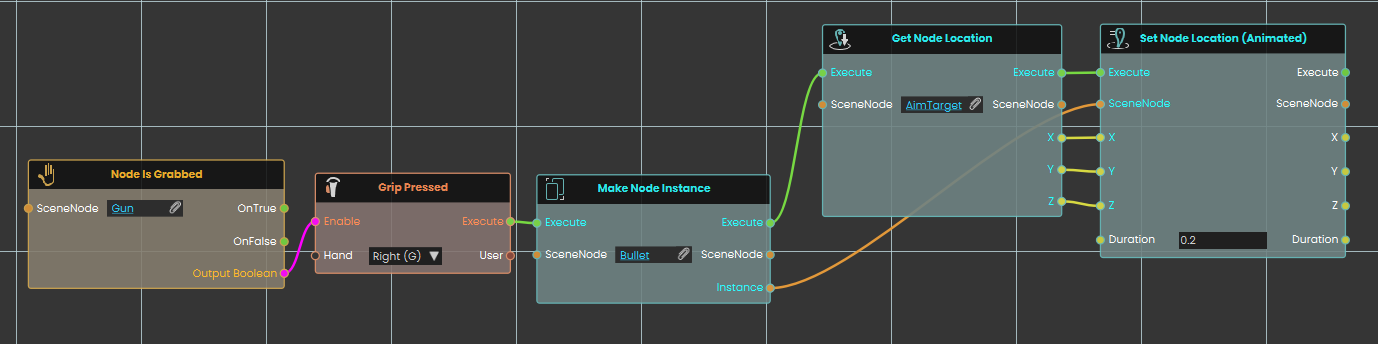 Once the grip is pressed, the Make Node Instance node activates, immediately generating a new instance of the "Bullet" object in the scene.