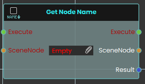 The Get Node Name node retrieves the exact text identifier of a specific 3D object within the scene. When activated, the node takes the targeted SceneNode input, extracts its assigned name, and outputs this text as a string value through the Result pin.