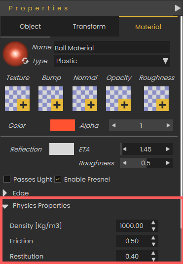 To configure how an object behaves during simulation, navigate to the Properties panel and select the Material tab. Under the Physics Properties section, you can adjust specific physical attributes for that material, such as its Density, Friction, and Restitution, which directly impact how the object interacts with the environment when physics are enabled.