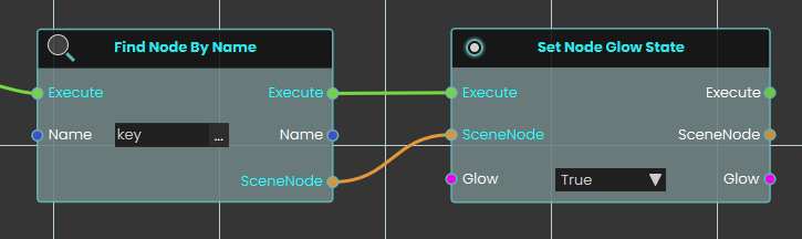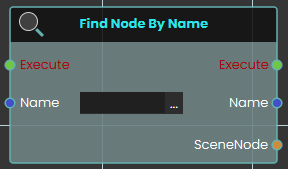 The Find Node By Name node searches the VR environment and dynamically locate a specific 3D object based on its assigned text identifier. When activated, the node takes the exact string provided in the Name input, searches the scene to find the corresponding object, and outputs that specific SceneNode reference.