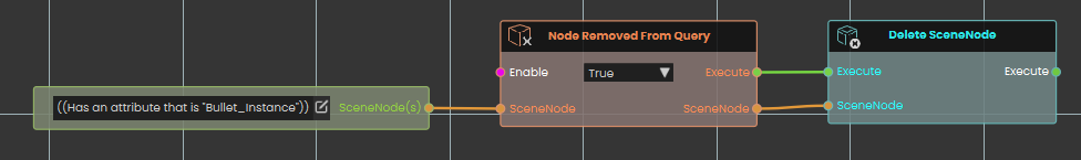 In this example, a Scene Node Query is configured to track any object that has an attribute named "Bullet_Instance". This query is connected directly to the SceneNode input of the Node Removed From Query event node. During the experience, if an object's attributes are altered so it no longer possesses the "Bullet_Instance" attribute (for example, if the attribute is removed after a collision), the event node automatically triggers and passes that specific object through its SceneNode output into a Delete SceneNode node.