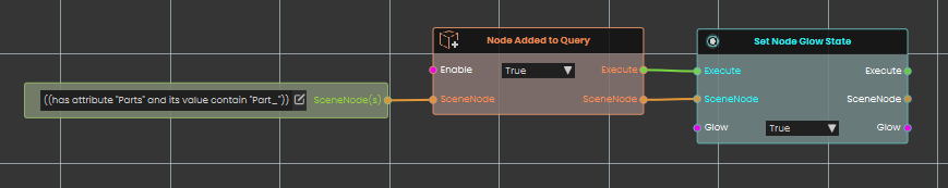 In this example, a Scene Node Query is configured to continuously look for any object that has an attribute named "Parts" with a value containing "Part_". This query is connected directly to Node Added to Query event node. During the experience, whenever an object has its attributes updated to successfully meet this exact condition, the event node automatically triggers and passes that specific object through its SceneNode output into a Set Node Glow State node.