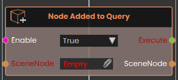 The Node Added to Query event node constantly monitors the scene and triggers its Execute output whenever a 3D object's attributes are modified to match the specific conditions defined by a connected Scene Node Query. By plugging a query into the node's SceneNode input, it listens for any object that newly meets these criteria—essentially being "added" to the query's list of valid results—and subsequently passes both the execution signal and the specific SceneNode that triggered the event through their respective outputs, allowing for dynamic, attribute-driven logic without needing to manually target individual objects.