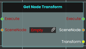 The Get Node Transform node retrieves the complete spatial data—including the exact location, rotation, and scale values—of a specific 3D object in the scene. When activated, the node takes the targeted SceneNode input, extracts its current transform matrix, and outputs this combined information through the Transform pin.