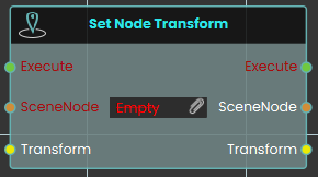 The Set Node Transform node instantly applies a complete set of spatial data—encompassing location, rotation, and scale—to a specific 3D object. Once activated, the node evaluates the targeted SceneNode and immediately updates its physical presence in the scene to perfectly match the data provided through the Transform input.