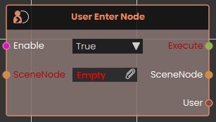 The User Enter Node event node continuously monitors the physical boundaries of a specific 3D object and activates the moment a user's avatar collides with or enters its volume. While enabled, it passes forward a reference to the specific User involved before continuing the logic flow. This functionality applies to all participants within multiplayer VR collaboration scenes.