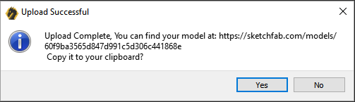 Once the uploading is completed a message will appear, with a link to the uploaded model. The message will also ask whether to copy the upload link to the clipboard in order to be able to use it by pasting in a web browser.