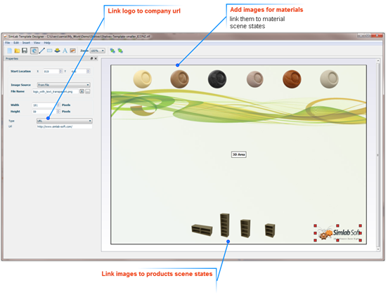 Add images for different products, and different materials along with links to their scene states created in SimLab Composer. Other actions can be added to an image, as described in SimLab Actions section.