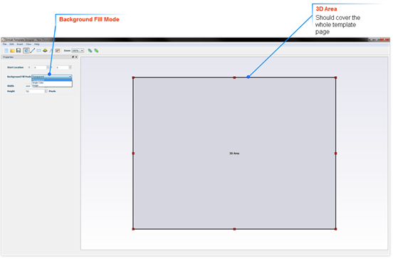 Add a 3D area that covers the whole template page. In the properties dialog on the left, the user can select the Background Fill Mode for the 3D area to be: