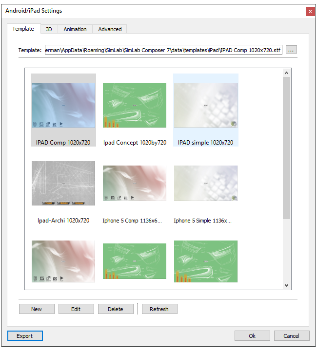 Template tab is where the user can browse to the folder containing the iPad/Android template(s) to use, create New templates, Edit, Delete, or Refresh template(s).